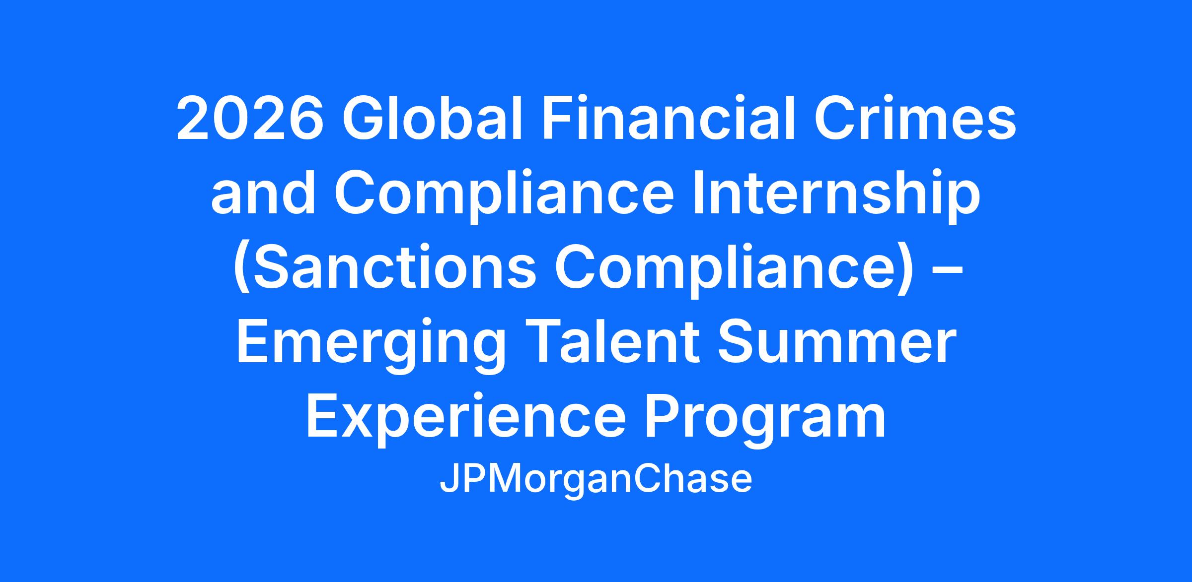 As a Emerging Talent Summer Experience Intern within the Global Financial Crimes Compliance team, you will support JPMorgan Chase’s Global Sanctions Compliance program and help protect the firm and its clients from financial crime risk. You will work alongside experienced professionals, gain exposure to sanctions investigation and screening processes, and develop an understanding of the regulatory environment governing global financial institutions.