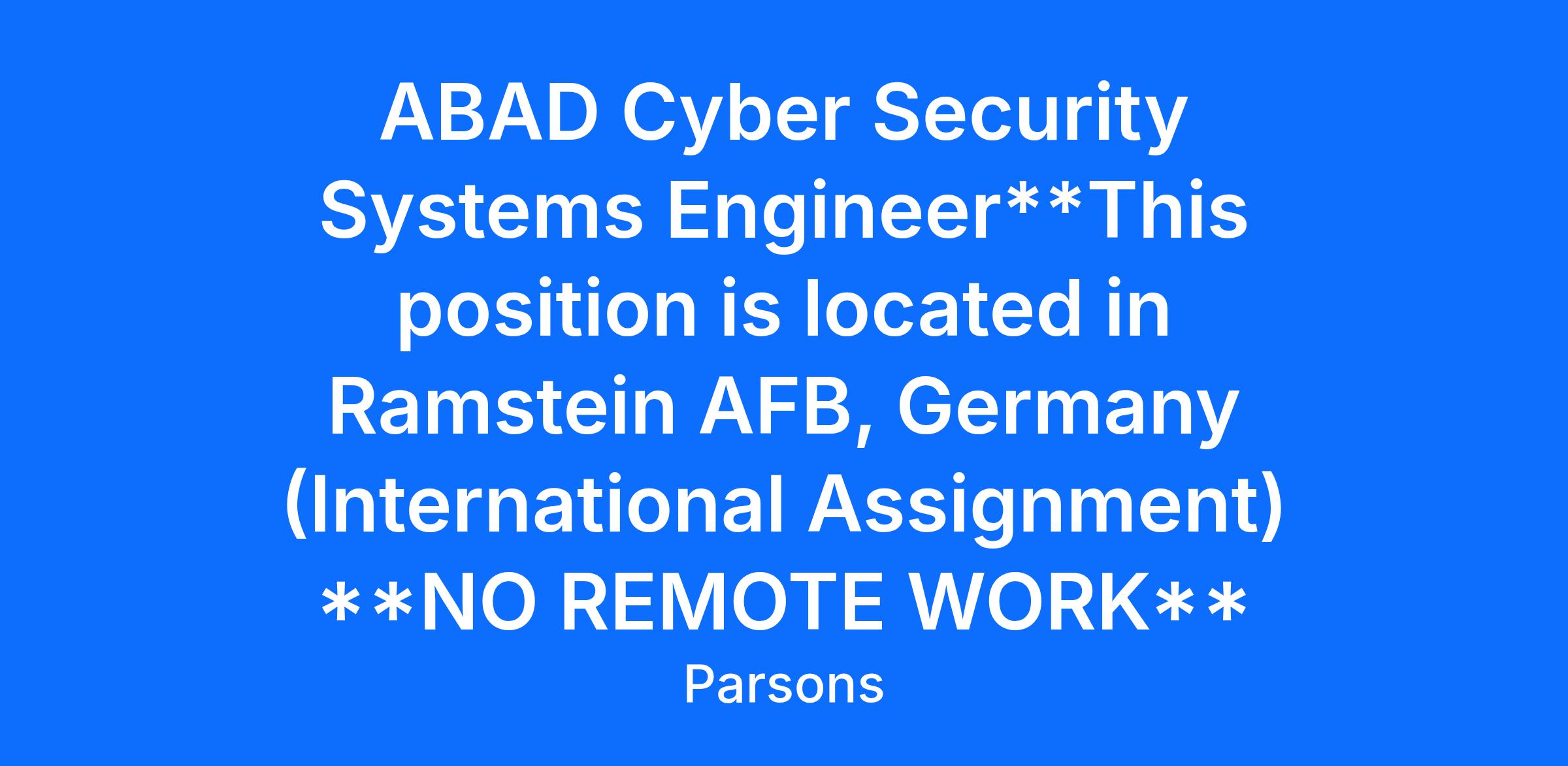 Parsons is looking for an amazingly talented Cyber Security Systems Engineer to join our team! In this role you will review Air Base Air Defense (ABAD) concept of operation, level of effectiveness, architecture, and design and provide oversight of documentation work. **This position is located in Ramstein AFB, Germany (International Assignment) **NO REMOTE WORK**