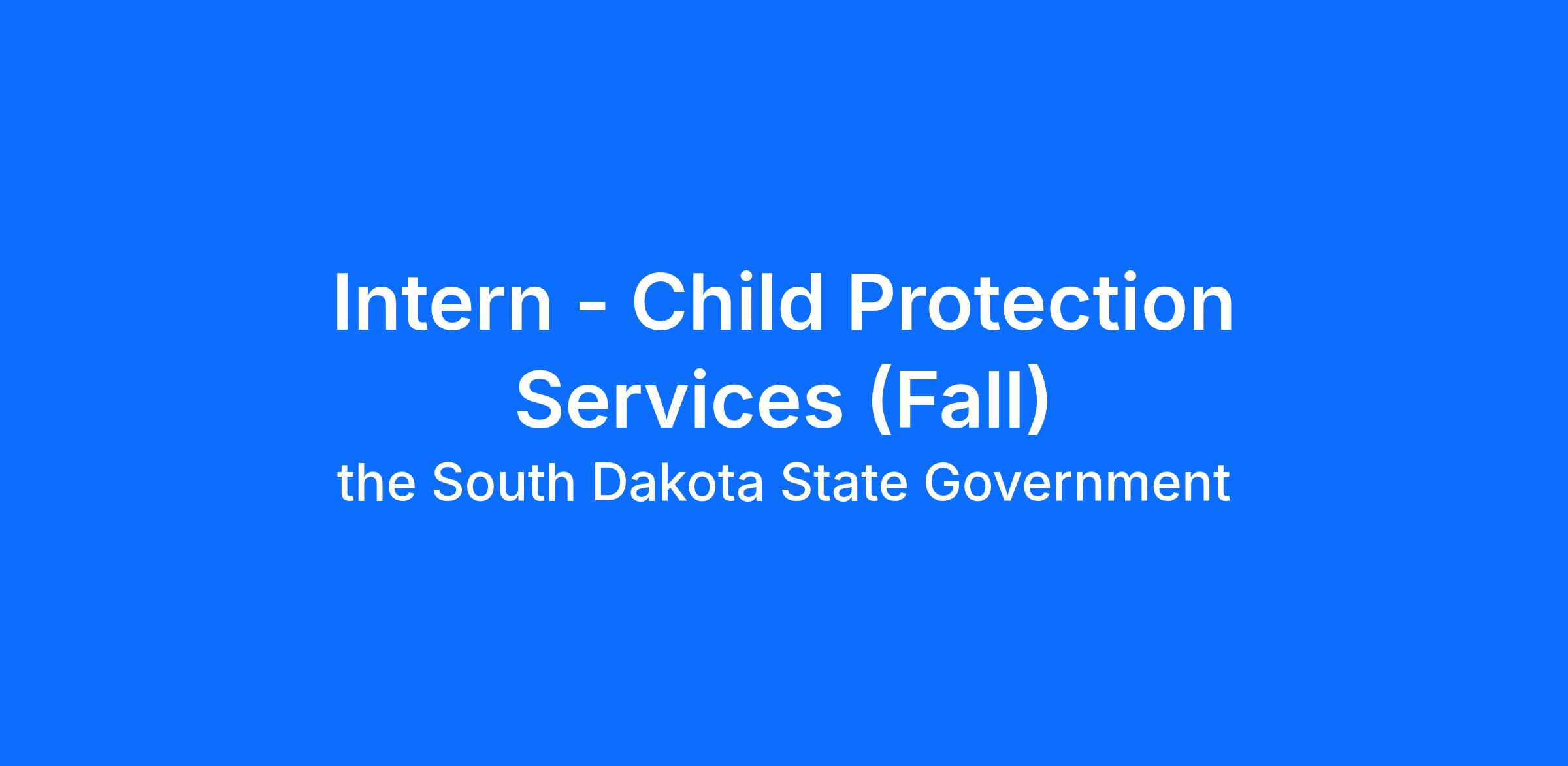 Session: Fall (September - January) Position Title:Intern - Child Protection Services Hiring Manager: Alisha Price Agency: Department of Social Services / Child Protection Services Location: Sioux Falls, SD Minimum Salary: $20.53 per hour