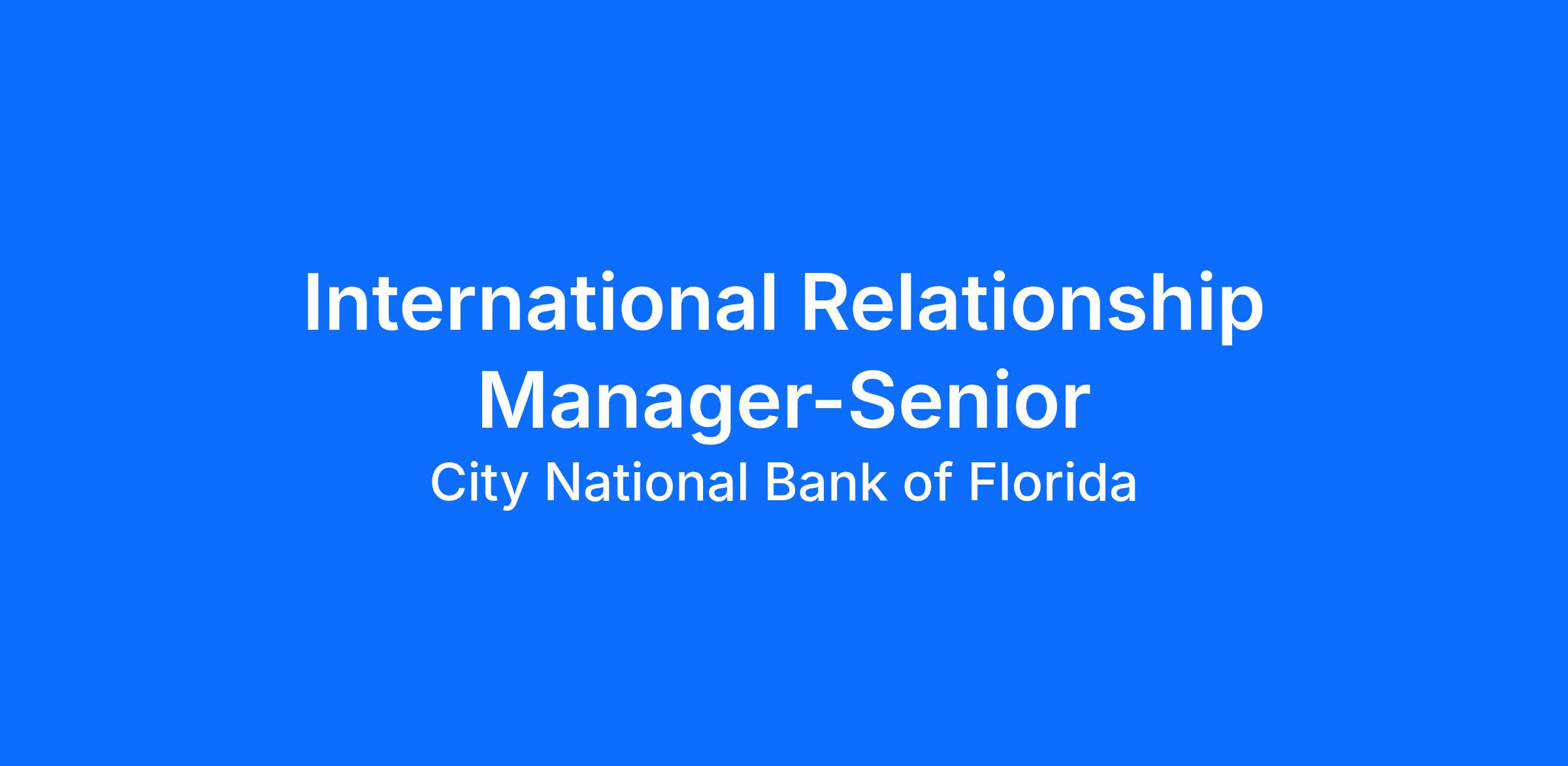 The International Relationship Manager Senior is responsible for building, managing, and retaining a portfolio of international high-net-worth individuals, and entrepreneurs, who reside outside of the United States, with some connectivity or nexus to the United States. The Relationship Manager expectation is to meet and exceed goals by developing new Wealth and Depository relationships with prospects and existing clients. Through a proactive need-based selling approach, the Relationship Manager will cross-sells bank products, including but not limited to Depository Products, Treasury Management Services and Consumer Lending products. The Relationship Manager will collaborate at a senior level with the assigned partner to establish, build, and expand Commercial Relationships for international high-net-worth individuals that own business, properties, second home in the United States.