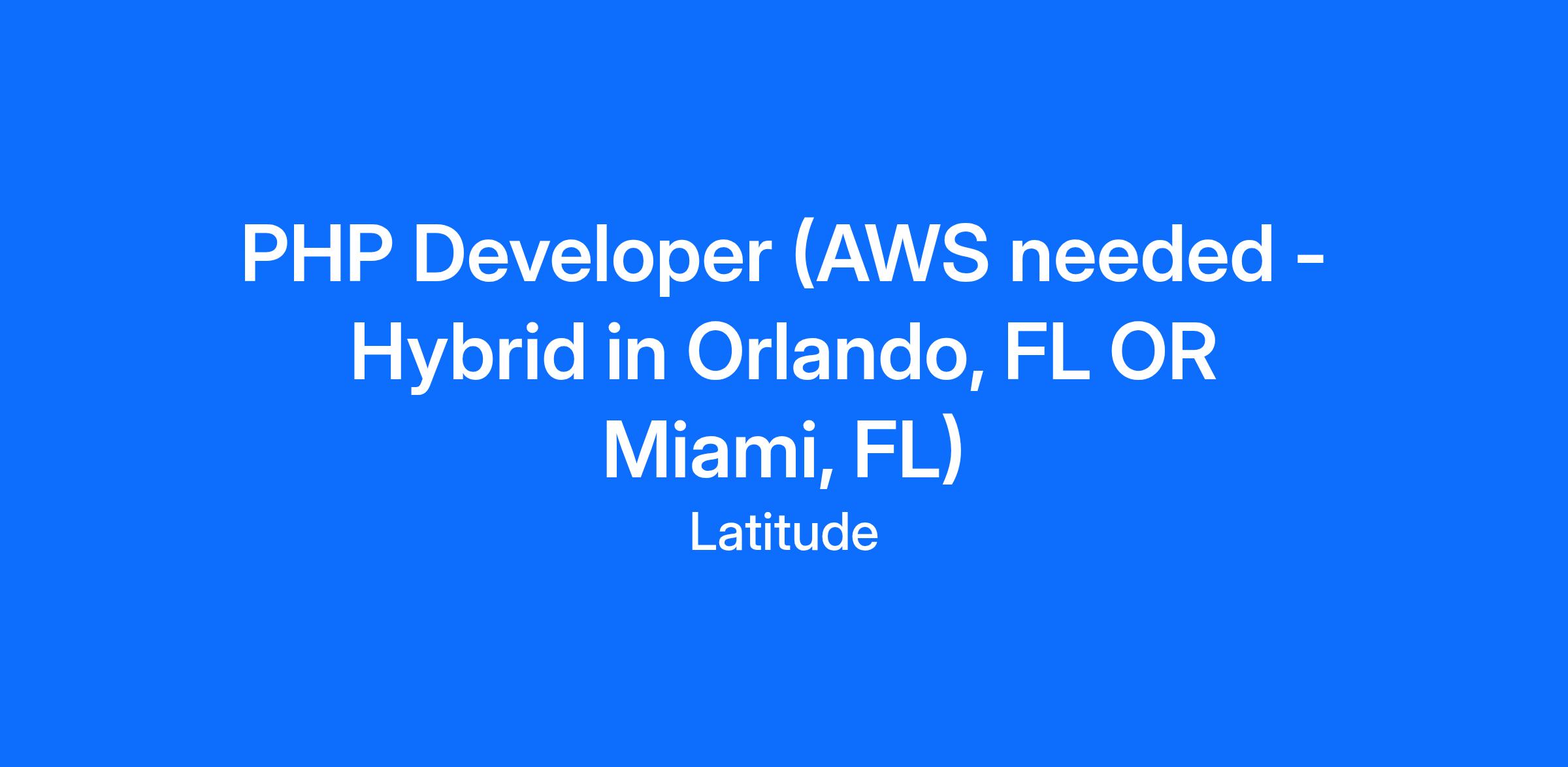 We are seeking a skilled PHP Developer with AWS experience for a Contract-to-Hire opportunity in Orlando, FL or Miami, FL. This is a HYBRID role that offers flexibility while requiring regular onsite collaboration at the respective local office.