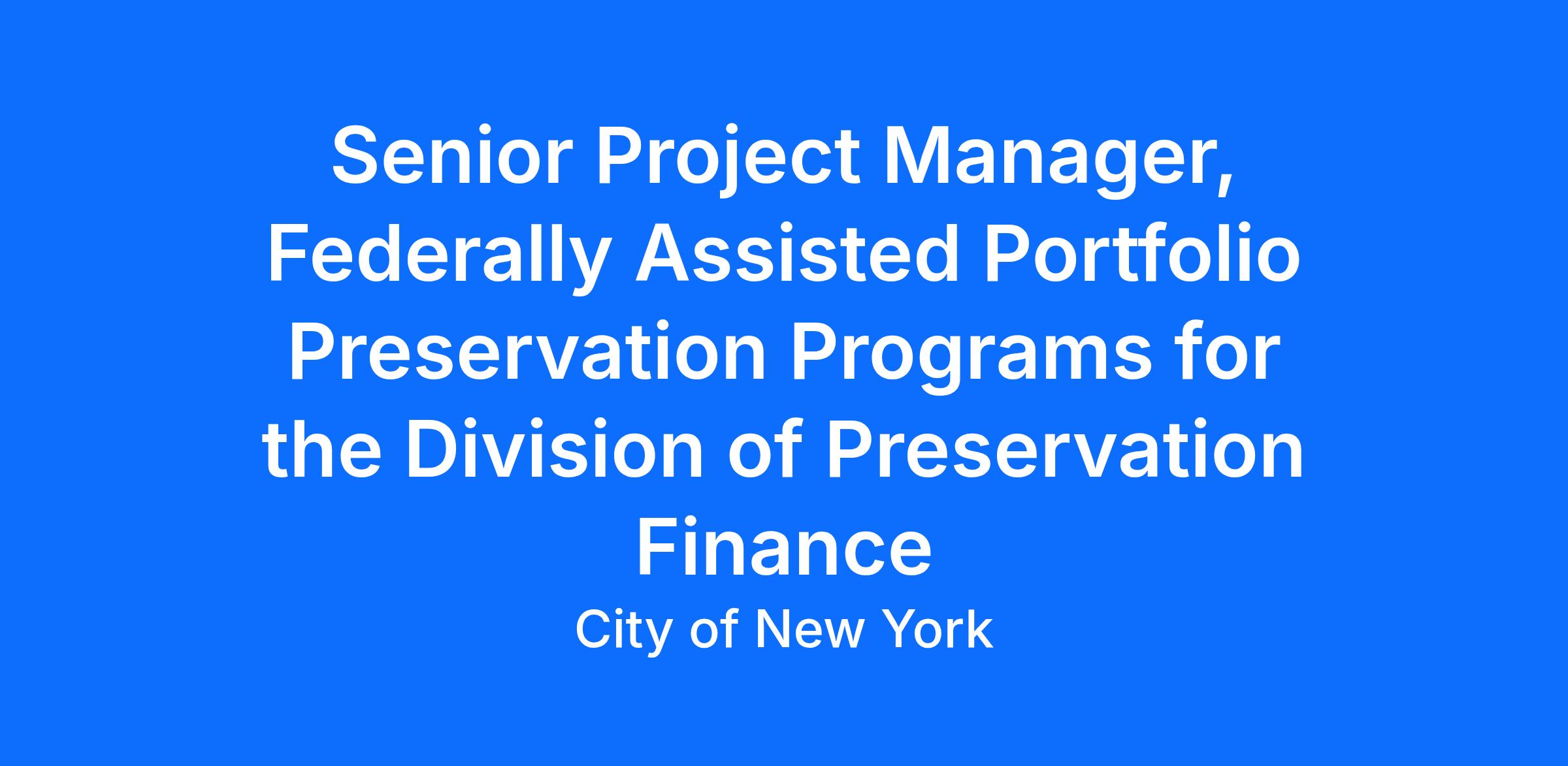 The Division of Preservation Finance seeks a Senior Project Manager for our Federally Assisted Portfolio Preservation Programs. The Federally Assisted Programs include Preservation Finance’s HUD Multifamily and Low Income Housing Tax Credit Preservation (Year 15) Programs. These two programs account for 19% of the annual MMR in Preservation and combined have closed an average of more than 3,800 units per fiscal year for Housing New York 2.0. Both programs focus on portfolios of projects that have previously received federal assistance via LIHTC (4% and 9%s) and/or where a majority of the units are covered by a form of project-based rental assistance in the five boroughs.