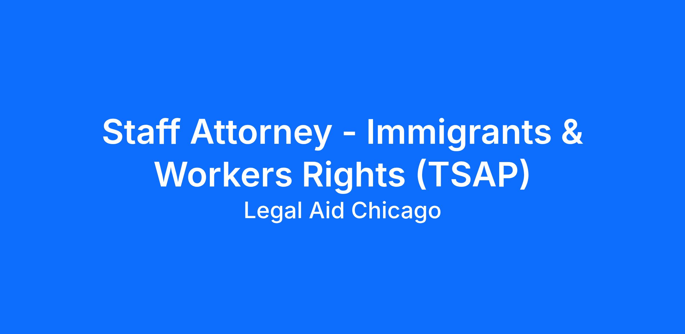 Position: Legal Aid Chicago seeks a full-time Staff Attorney to work in the Trafficking Survivor Assistance Project (TSAP) within the Immigrants & Workers’ Rights Practice Group (IWR). IWR includes the areas of employment, immigration, migrant farmworker, and human trafficking law. IWR’s four teams work independently and in an interdisciplinary manner, when these areas of law intersect. This position works collaboratively within a supportive team of attorneys and paralegals and reports to an experienced Supervisory Attorney.